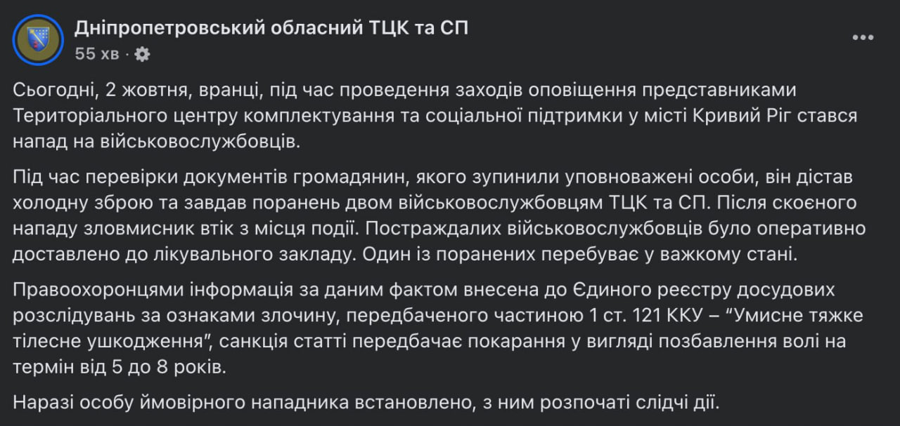 Мужчина порезал ножом двух военкомов в Кривом Роге, один из них в тяжелом состоянии — областной ТЦК