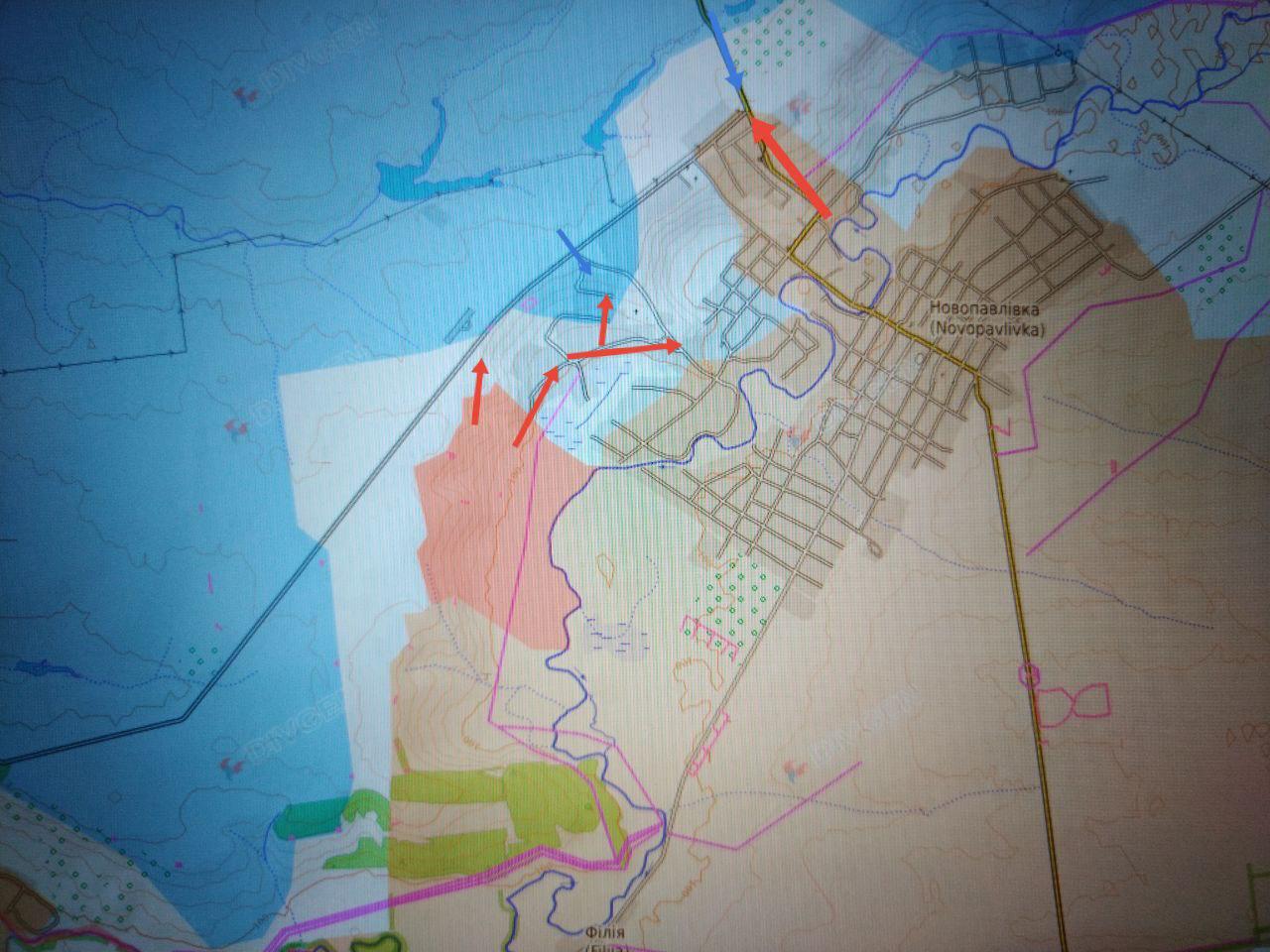 В районе Новопавловки наши подразделения продолжили занимать с южного направления опорные пункты противника на высотах у западных окраин, выйдя к дороге на Ивановку у аэродрома и северо-восточнее, и продвинулись в западной части Новопавловки, заблокировав южный выезд западнее и юго-восточнее кладбища.