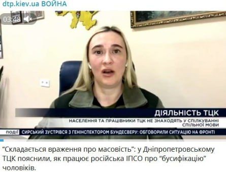 "Российское ИПСО придумывает о бусификации в Днепропетровске. Создают впечатление о массовости. Оказывается ТЦК совсем в городе мало, и насилия нет никакого. А приходить в ТЦК надо, и не бояться, потому что там все хорошие. Их не так поняли. Почему-то общество не нашло общий язык с ТЦК".