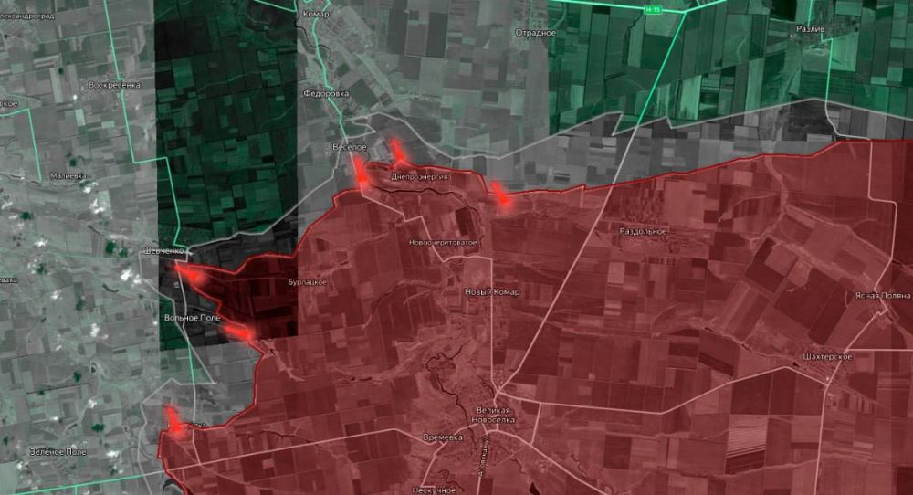 «На Времьевском направлении в районе н.п. Веселое ВС РФ в результате наступательных действий вклинились в оборону ВСУ, что позволяет им создать предпосылки для расширения зоны давления на соседние участки фронта. Параллельно штурмовые отряды ВС РФ продвигаются в сторону села Комар.