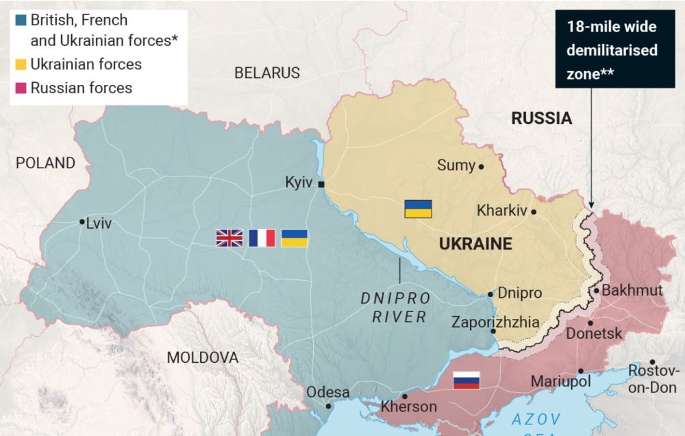 Генерал Кит Келлог предположил, что британские и французские войска как часть "сил успокоения" могли бы поделить запад Украины на зоны контроля в противовес российской армии на востоке. Между ними могли бы дислоцироваться украинские вооруженные силы и пролегать широкая демилитаризованная зона. Генерал считает, что иностранные войска, размещенные к западу от Днепра, "вовсе не будут провокационными" для Москвы.