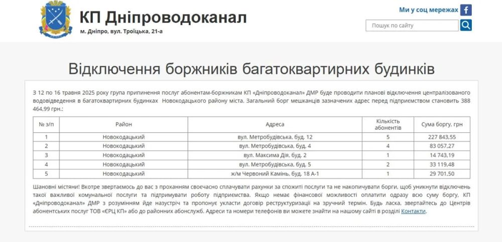 Общая сумма неоплаченных счетов жителей по этим адресам составляет более 508 тысяч гривен. В «Днепроводоканале» подчеркивают, что вынуждены прибегнуть к такому шагу из-за систематического пренебрежения платежной дисциплиной.