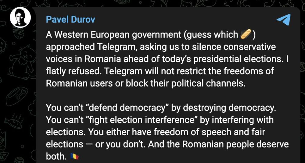 "Западноевропейское правительство (угадайте какое ) обратилось к Telegram с требованием заставить замолчать консервативные голоса в Румынии перед сегодняшними президентскими выборами. Я категорически отказался. Telegram не будет ограничивать свободы румынских пользователей или блокировать их политические каналы.