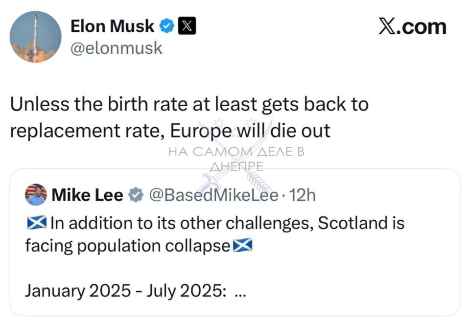 Илон Маск опубликовал статистику по Шотландии: с января по июль 2025 года в стране родилось 26,3 тыс. человек, умерло — 35,2 тыс.