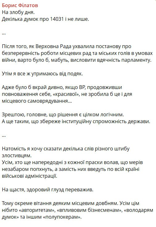 Недавно Борис Филатов в своей телеге написал пост на злобу дня