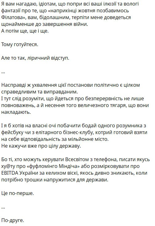 И то, что мэр Филатов написал огромную простыню текста строча по клавиатуре, что ему работа мэра и не нужна вовсе, но он всё же останется мэром и будет им вечно.