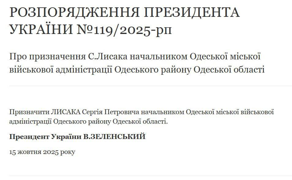 На сайте ОП опубликовано распоряжение Зеленского о назначении днепропетровского губернатора Лысака главой новосозданной военной администрации Одессы.