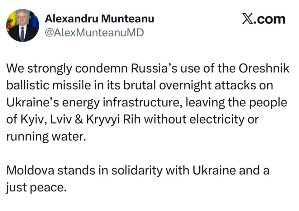 Мы решительно осуждаем использование Россией баллистической ракеты "Орешник" в ходе жестоких ночных атак на энергетическую инфраструктуру Украины, в результате которых жители Киева, Львова и Кривого Рога остались без электричества и водопровода.