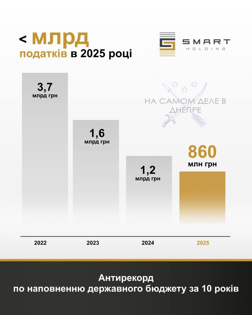 В прошлом году компании группы Smart-Holding впервые за десятилетие уплатили в бюджет менее 1 млрд грн. За несколько лет платежи упали в разы — с 3,7 млрд грн в 2022 году до 860 млн грн в 2025-м.