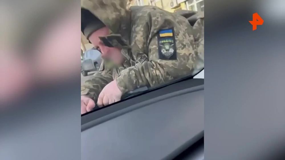 На кадрах видно, как военком держится за дворник, чтобы не упасть, и кивком призывает водителя остановиться.