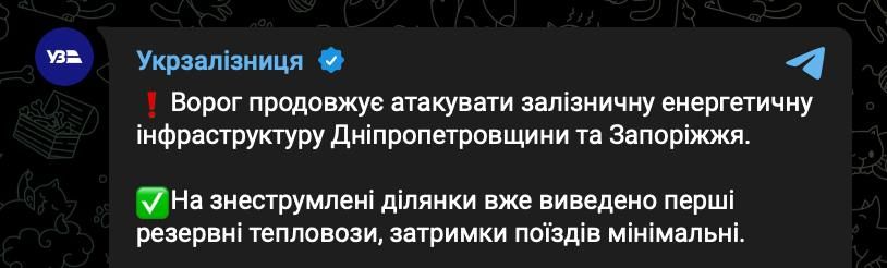 Ночью РФ нанесла удары по энергетике «Укрзализныци», сообщила компания.