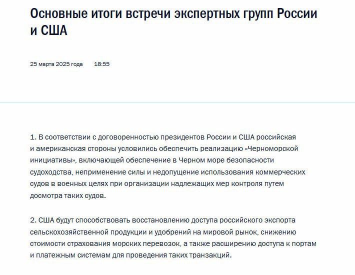 Россия и США условились обеспечить реализацию «Черноморской инициативы», включающей обеспечение в Черном море безопасности судоходства, неприменение силы и недопущение использования коммерческих судов в военных целях при организации надлежащих мер контроля путем досмотра таких судов, — Кремль.