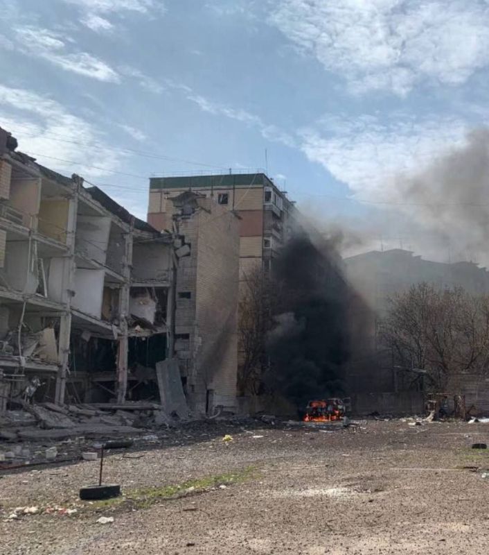 Фото здания в Кривом Роге, как сообщают украинские власти - инфраструктурный объект, по которому был прилёт, рядом загорелась машина, она и дымила.