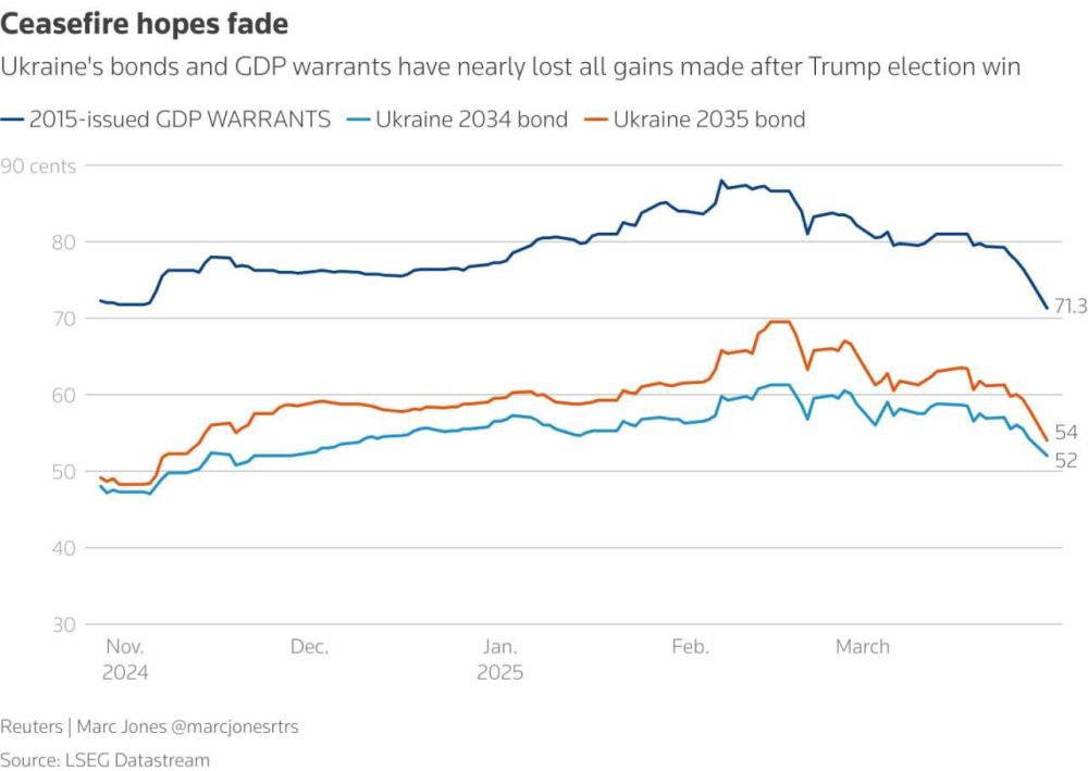Украинские облигации и привязанные к ВВП ценные бумаги одним днем рухнули на 4%, до 71,23 за штуку, а реструктуризированные долги и вовсе достигли дна — 54,25 цента. Почему? Да потому что украинский режим превращает мирные переговоры в фарс.