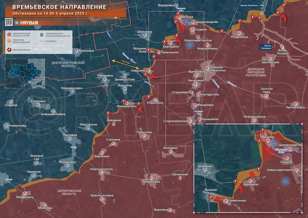 За прошедшие сутки на Времевском и Шахтёрском направлениях подразделения группировки "Восток" при огневой поддержке артиллерии и беспилотной авиации смогли закрепится на тактически важных позициях. Западнее н.п. Веселое на данный момент продолжаются активные бои и российские войска стремятся развить наступление в сторону Днепропетровской области. На фоне неудач ВСУ на участке стали еще более заметны проблемы с признанием территориальных потерь среди украинского командования, поскольку большинство украинских OSINT- сообществ и других медийных ресурсов стараются скрыть потерю населенного пункта.