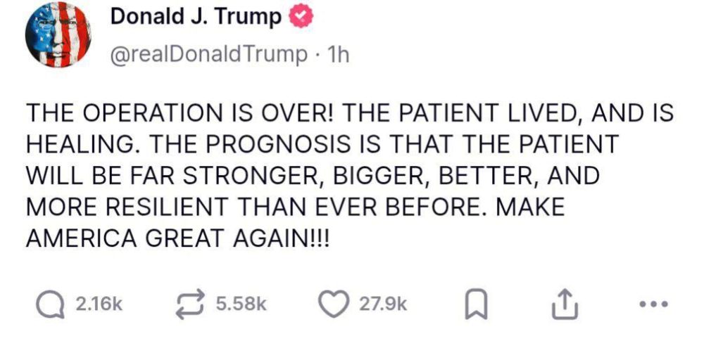 «Операция завершена! Пациент выжил и восстанавливается. Прогноз такой: пациент станет гораздо сильнее, больше, лучше и устойчивее, чем когда-либо. Сделаем Америку великой снова!»
