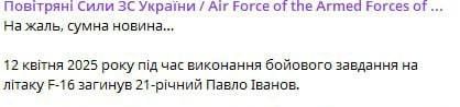 На Украине сбит ещё один F-16. Украинские информационные ресурсы ссылаясь Воздушные силы ВСУ сообщили о ликвидации украинского лётчика. "Во время выполнения боевого задания на самолете F-16 погиб 21-летний летчик Павел Иванов".