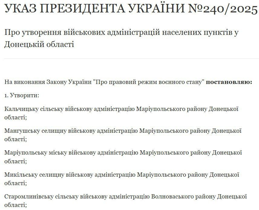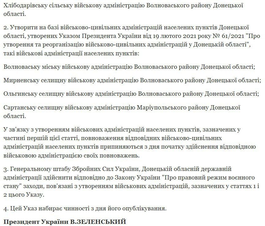 Всего Зеленский образовал 10 военных администраций в Донецкой области. В частности, в Мариупольском районе созданы Кальчицкая сельская, Мангушская поселковая, Мариупольская городская, Никольская поселковая и Сартанская поселковая военные администрации.