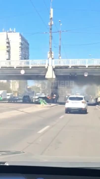 ДТП. Жесткая авария на Правде - авто влетело в опору виадука и загорелось. О пострадавших пока что не сообщается.