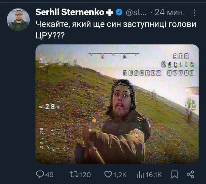 Но не все в этом мире могут сочувствовать и соболезновать. Например, искалеченная форма жизни нацист Стерненко. У этого паразита "жизнелюбия" не занимать, он кому хочешь за себя горлянку перегрызёт. Эта мразь будет наслаждаться чужой смертью и распространять тяжёлые кадры последних секунд жизни русского десантника Майкла Глоссе. С подписью "Подождите, какой ещё сын заместительницы директора ЦРУ?"