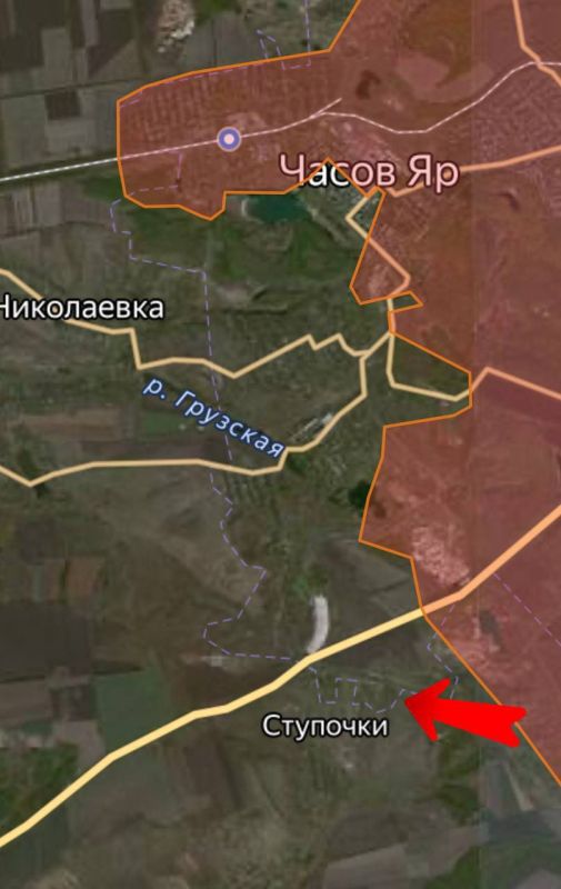 Севернее Ступочек на развязке, по которой противник доставляет резервы как в сами Ступочки, так и в Центральный район Часов Яра, наши операторы БПЛА выявили замаскированный транспорт в одном из зданий, после чего нанесли комплексный удар артиллерией и дронами со сбросами.