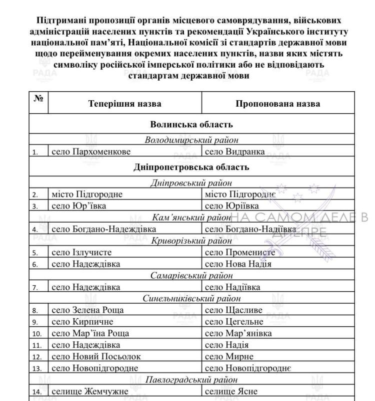 И снова переименования. Когда собаке нечего делать...Ну, вы поняли. Особенно развеселило село "Выдранка". Киевский режим умеет воевать только со своим собственным народом, советскими памятниками и названиями улиц. Проверенный чинушами схематоз, чтобы продолжать грабить страну - в любой непонятной ситуации говори, что это русские во всем виноваты, поэтому нужно срочно переименовать вон тот переулок.