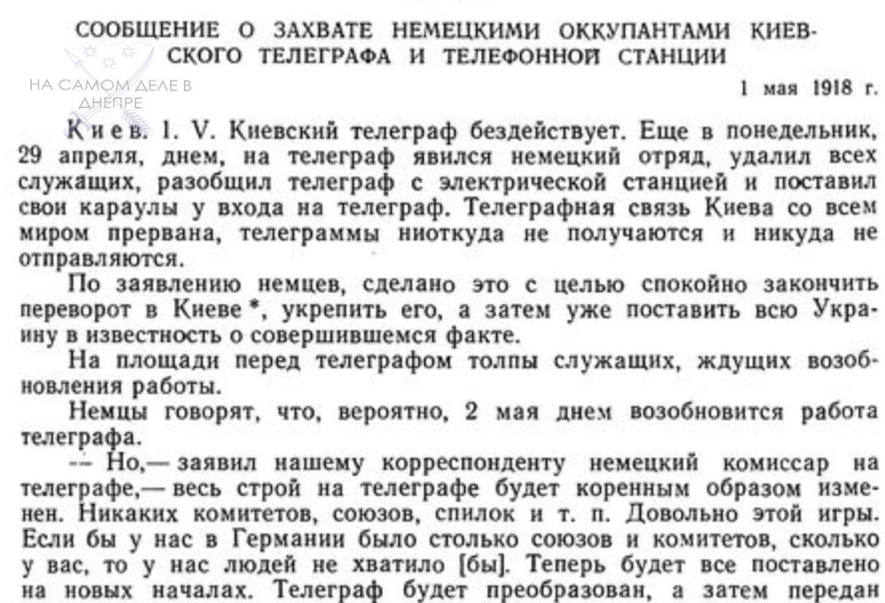 В 1918 году, в эти же майские дни, немецкие войска свергли Центральную Раду, поставив у власти марионеточного гетмана Скоропосадского.