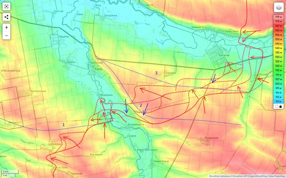 Здесь вчера продолжалось наше наступление севернее н.п. Днепроэнергия и мы сумели неплохо здесь продвинуться на север.