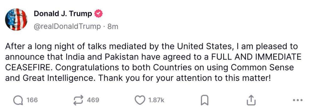 «После долгой ночи переговоров при посредничестве Соединенных Штатов я рад объявить, что Индия и Пакистан договорились о полном и немедленном прекращении огня» – заявил Трамп.