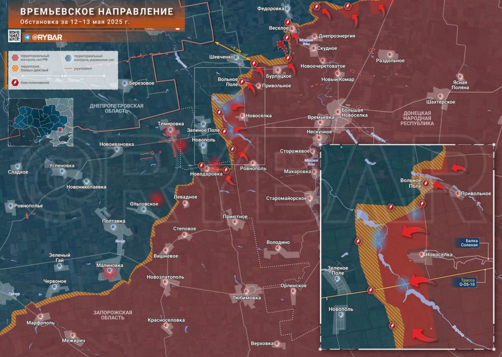 Обстановка на Времьевском направлении остаётся динамичной. Российские войска сконцентрировали основное внимание продвижении в границах населенных пунктов и у естественных укрытий (балки, водоёмы). Преимущество ВСУ в дронах не позволяет стабилизировать ситуацию. Противник вынужден отходить от занимаемых позиций ближе к границам с Днепропетровской областью, а линия фронта стабильно смещается на запад к очередному рубежу обороны украинских формирований.