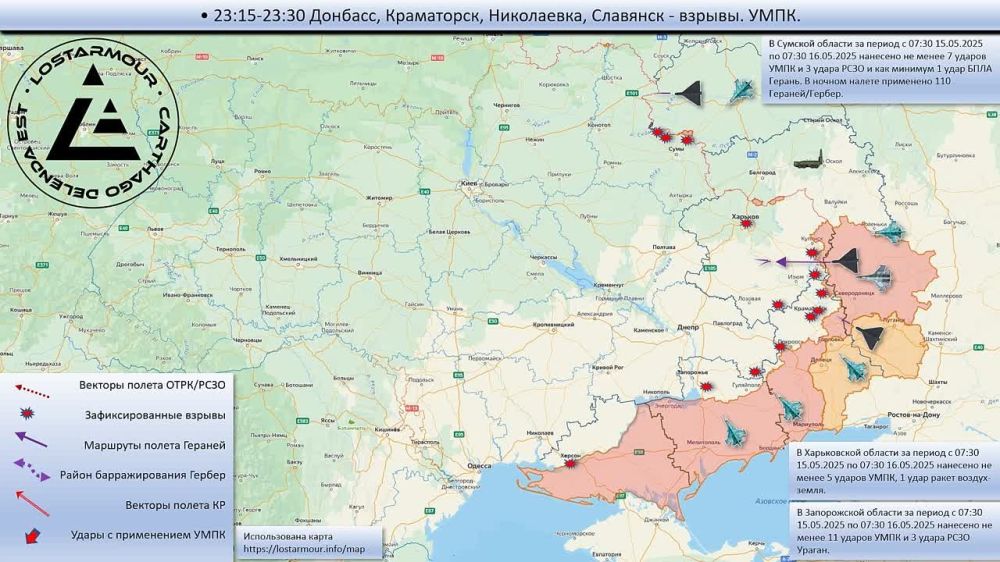 Анимированная схема ударов по территории Украины 15-16 мая 2025 года
