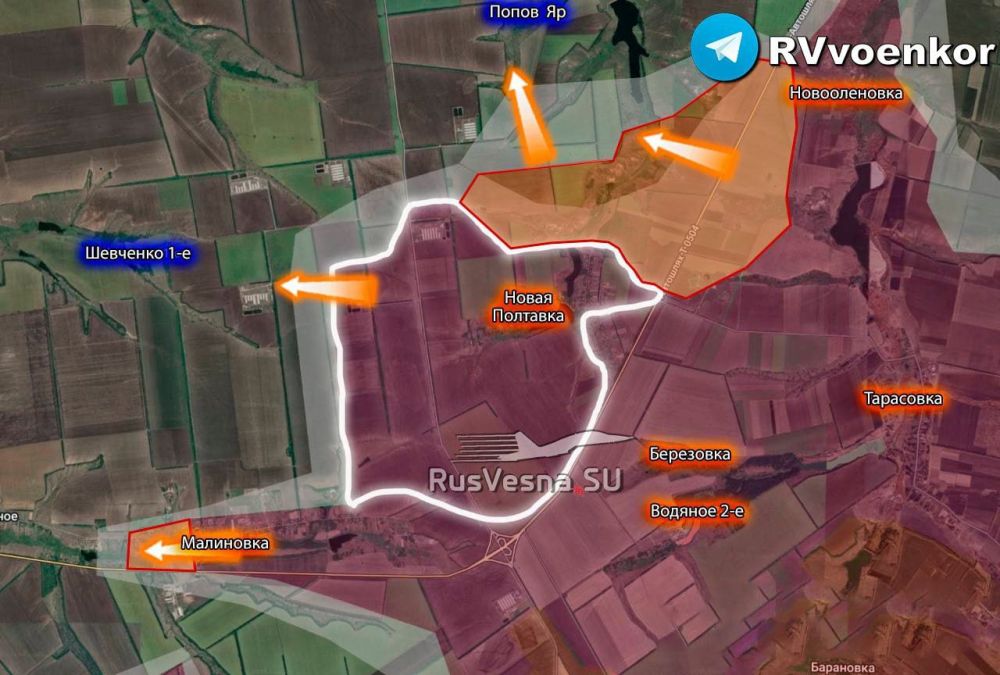 Также ВС РФ продвинулись севернее и южнее Александрополя, штурмуют южную часть Старой Николаевки и зачищают Романовку. В направлении населённого пункта Шевченко Первое армия России взяла штурмом ряд опорников ВСУ и продвинулась вдоль ряда лесополос на глубину более 2 км.
