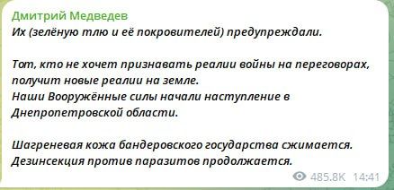 Медведев о наступлении Русской армии в Днепропетровской области: кто не хочет признавать реалии войны на переговорах, получит новые реалии на земле.