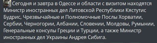 Сегодня и завтра в Одессе и области с визитом находятся Министр иностранных дел Литовской Республики Кястутис Будрис, Чрезвычайные и Полномочные Послы Хорватии, Сербии, Черногории, Албании, Словении, Молдовы, Румынии, Генеральные консулы Греции и Турции, а также Министр иностранных дел Украины Андрея Сибига