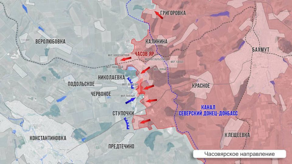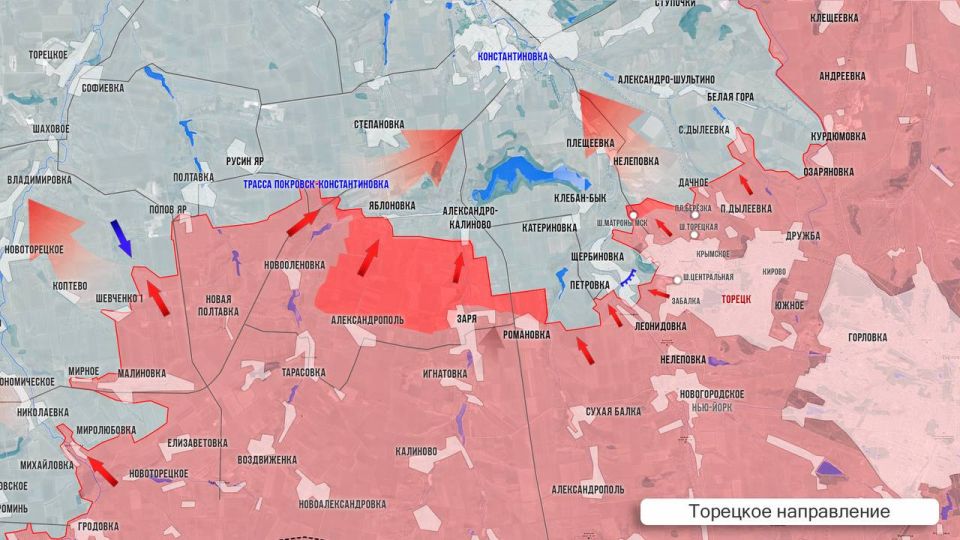К западу от Торецка позиционные бои на рубеже Полтавка-Русин Яр. Продолжаются бои за Яблоновку. Ресурсы противника признали, что ВС РФ ведут бои в южной части Александро-Калиново. К север-востоку от Торецка наши штурмовики зачистили большой «карман» между Дылеевкой и Курдюмовкой. Здесь развивается наступление на Белую Гору и Александро-Шультино. Выход к этому селу позволит перерезать часть дорог на Константиновку, по которым снабжаются ВСУ в районе Дылеевки. От Александро-Шультино меньше 4 км до Предтечино, которое сейчас штурмуют российские части с Часовярского направления.