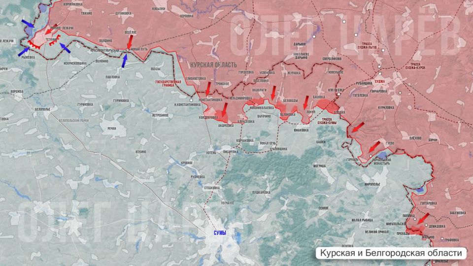 В приграничье Сумской и Курской областей в районе Тёткино и Нового Пути нашив военные продолжают держать оборону и отражать атаки врага. ВСУ атакуют мосты и переправы через Сейм, пытаясь максимально затруднить нашу логистику. В Сумской обл ожесточённые бои продолжаются в Новониколаевке, Яблоновке и Юнаковке.