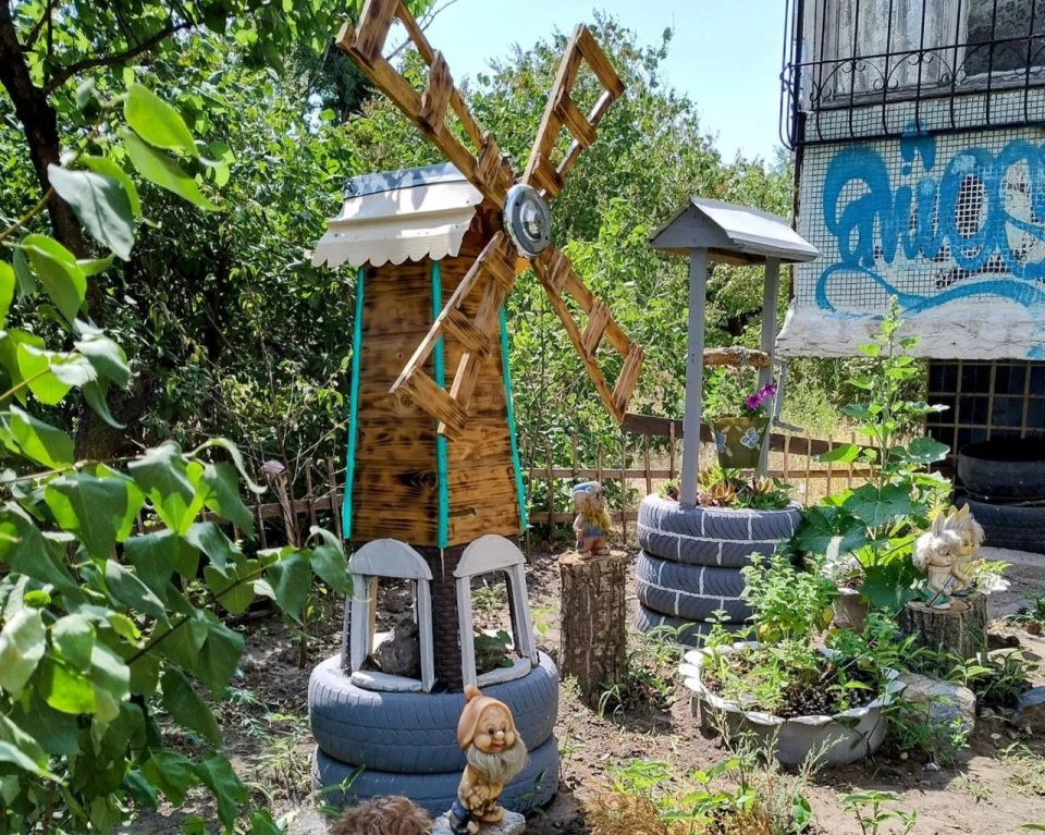 Жители также своими руками сделали мельницу и колодец из дерева и покрышек. Изюминкой стал креативный металлический флюгер в виде черного петуха.