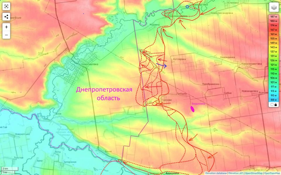Наши части 90-ой танковой дивизии, не стали останавливаться на границе с Днепропетровской областью и после подтягивания флангов заняли несколько лесопосадок в сторону Новопавловки.