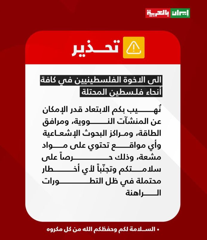 Нашим палестинским братьям по всей оккупированной Палестине.Мы настоятельно рекомендуем вам держаться как можно дальше от ядерных объектов, энергетических объектов, центров радиационных исследований и любых объектов, содержащих радиоактивные материалы, ради вашей собственной безопасности и во избежание любых потенциальных опасностей в свете текущих событиям