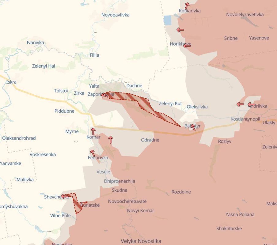 «Пока все военные блоггеры рассказывают об Иране и Израиле, ВС РФ продвинулись в направлении Запорожской и Днепропетровской областей – со стороны Великой Новоселки, а также по линии Запорожья – Богатырь. Также они продолжают двигаться в сторону Яблоновки к югу от Константиновки.