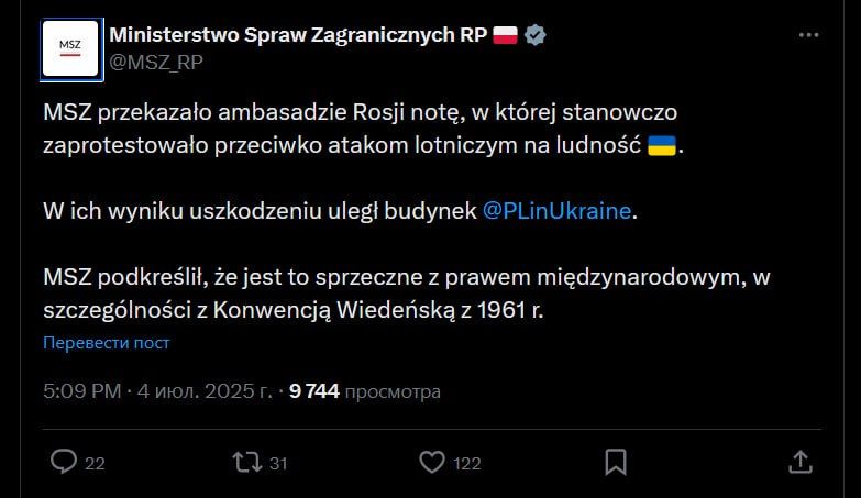 «Авиаудары по населению»: Польша обвинила Россию в атаке на своё посольство