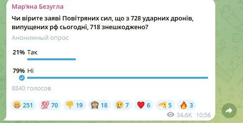 Так, 79% принявших участие в опросе не верят недавнему заявлению Воздушных сил, что в ходе одного из последних массовых налетов Украина смогла обезвредить 718 из 728 беспилотников.