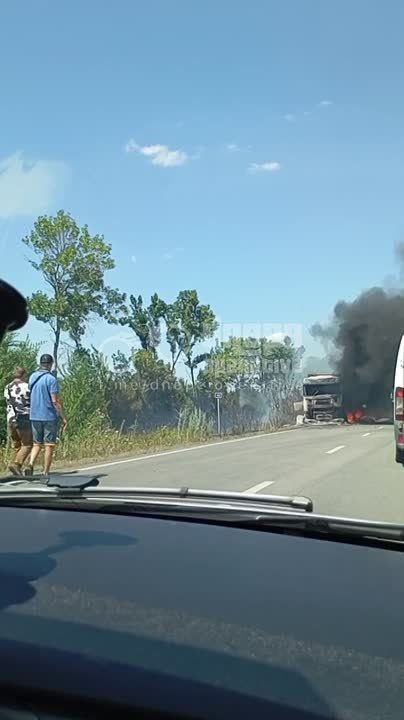 На трассе Днепр-Никополь горит грузовой автомобиль. Густой черный дым виден на несколько километров.