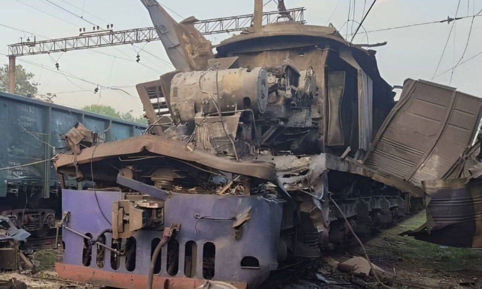 Украинский электровоз, уничтоженный ударами российских дронов-камикадзе в Днепропетровской области.