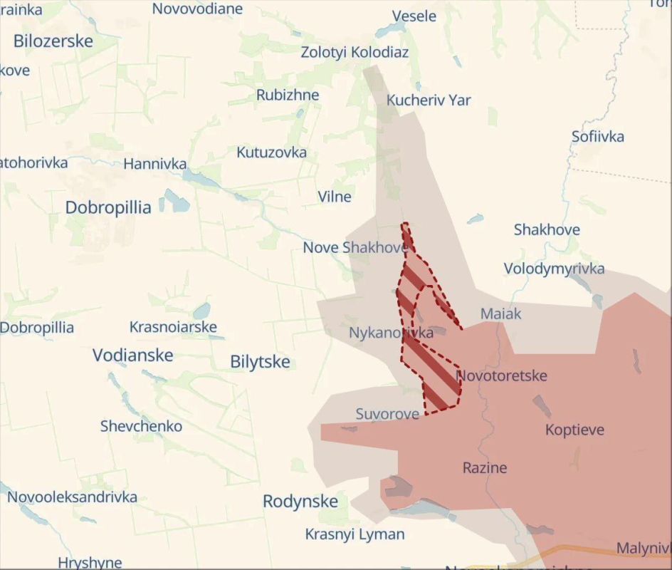 Картинка с пропагандистского укроресурса - не для точной иллюстрации линии фронта (в свою пользу они ее искажают систематически и сильно), а скорее для иллюстрации того минимального, что даже хохлы не пытаются отрицать, как бы ни текли слезы по пятачку. И даже по этой картинке хорошо видно, что замысел операции гораздо шире, чем просто обрезать коммуникации Красноармейска с Димитровом, которые на этой картинке заметно южнее ее нижнего края. И учитывая то, с чего начали - развернуть вектор дальнейшего движения в глубине, да и у основания этого языка, можно очень по-разному - угадывать конечный замысел нашего командования на дальнейшее можно даже не пытаться.