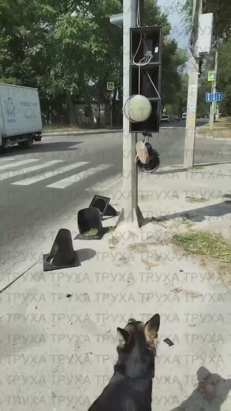 Светофор на перекрёстке ул. Янгеля разломался и повис на проводах, но самое интересное, что он всё равно работает.