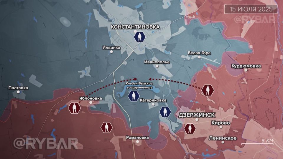 На центральном участке российские войска постепенно сжимали «клещи» вокруг ВСУ южнее Клебан-Быкского водохранилища. В результате нескольких атак ВС РФ завязали бои за Катериновку, а также закрепились в полях севернее Дзержинска.