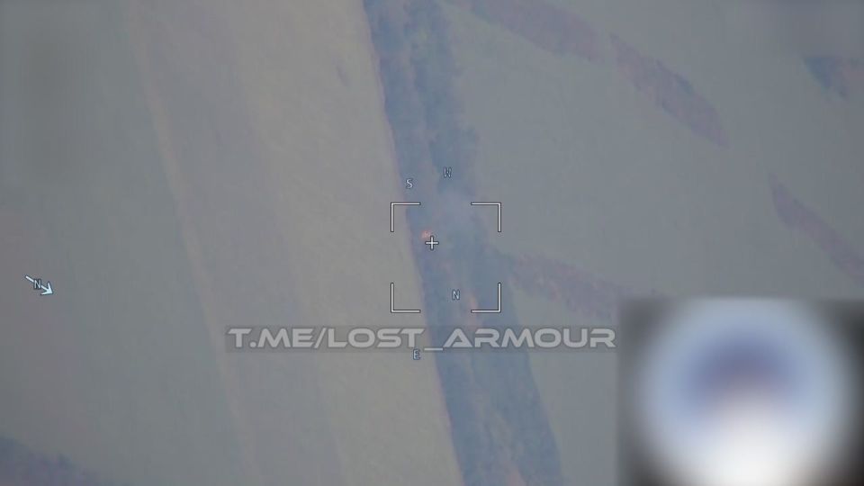 Менее чем в 1,5 км южнее (на видео захода "Ланцета" на цель выделен горящий танк ВСУ с предыдущего видео) зафиксирована укрытая техника противника (по данным расчета SuperCam - танк). По цели отработали барражирующим боеприпасом "Ланцет". Наведение и объективный контроль осуществляет БПЛА Zala. Цель уничтожена.