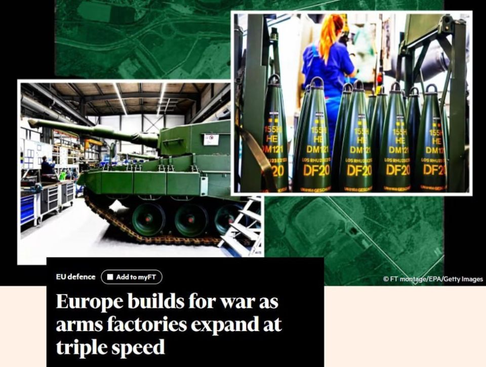 И при этом активно идет ремилитаризация Европы. Financial Times сообщает, что спутниковые снимки показали увеличение площадей оружейных заводов в Европе. Сейчас они расширяются в три раза быстрее, чем до начала российско-украинского конфликта. Их площадь превысила 7 миллионов квадратных метров в масштабах, невиданных за последние десятилетия.