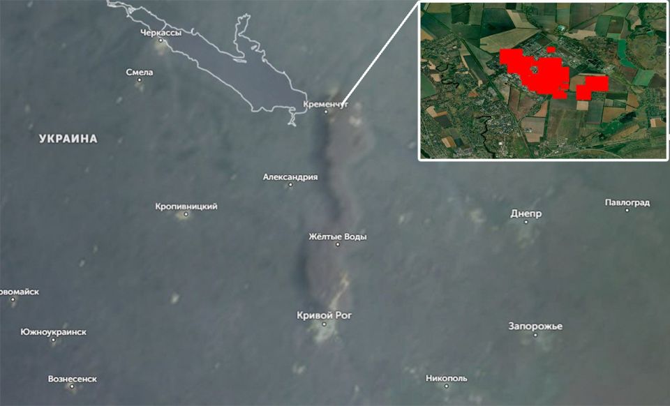 Облачность... Дымный хвост от масштабного пожара на НПЗ долетел аж до Кривого Рога (~ 140 км на минуточку)